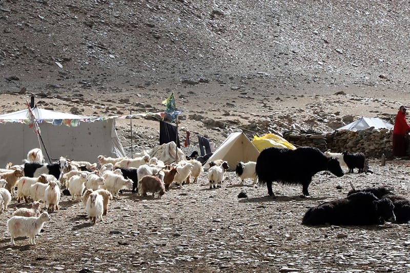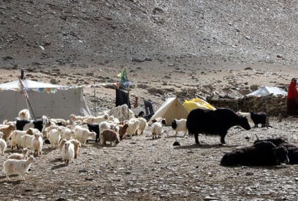 Continue your trek, we cross a stream and pass close to a mani wall, sculpted by the Chang Tang herders. We then hike up to the Nuruchan La (4750m), before descending easily to cross another stream and another low pass. In this area, the nomadic herdsmen that we meet are likely to be Tibetan, having been displaced here from the western part of that cross-border territory. We camp at Rachungkaru (4952m) amongst grazing yaks, sheep and pashmina goats. Afternoon at leisure.